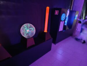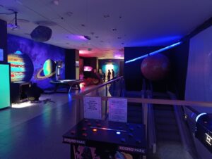 Niestety muszę stwierdzić, że wygląda to słabo. Sufit poznaczony jest wyciętymi otworami na lampy/głośniki, ale zasłoniętymi papierem. Ściany przykryte plandekami z kiczowatymi grafikami. „Planetarium” to raptem mały namiot ze słabej jakości projektorem. Pod jedną ze ścian są planety i wagi, które pokażą naszą hipotetyczną wagę przy innej grawitacji, gdzieś tam leży lego Sokół Millennium, 1:1 Chewbacca, kilka popsutych eksponatów (!!), jakieś 3 LCD dotykowe, które oferują „rozrywkę” dla dzieci w formie słabych aplikacji rodem z Google Play Store.